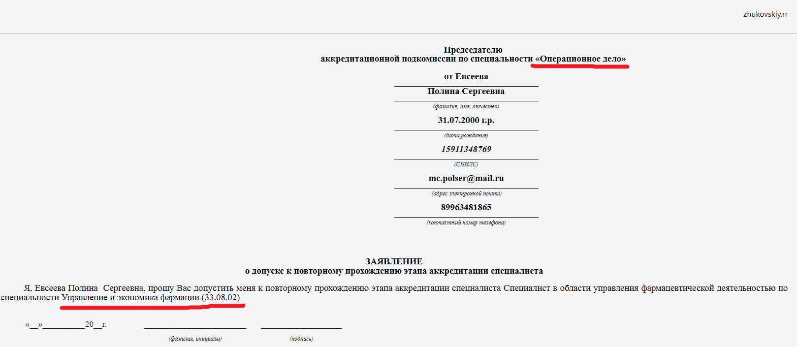 Внутри попытки на пересдачу этапа нашёл ошибку автозаполнения формы в шаблоне "Заявление о допуске к пересдаче". У всех независимо от специальности аккредитуемого в шапке пишется "Операционное дело"